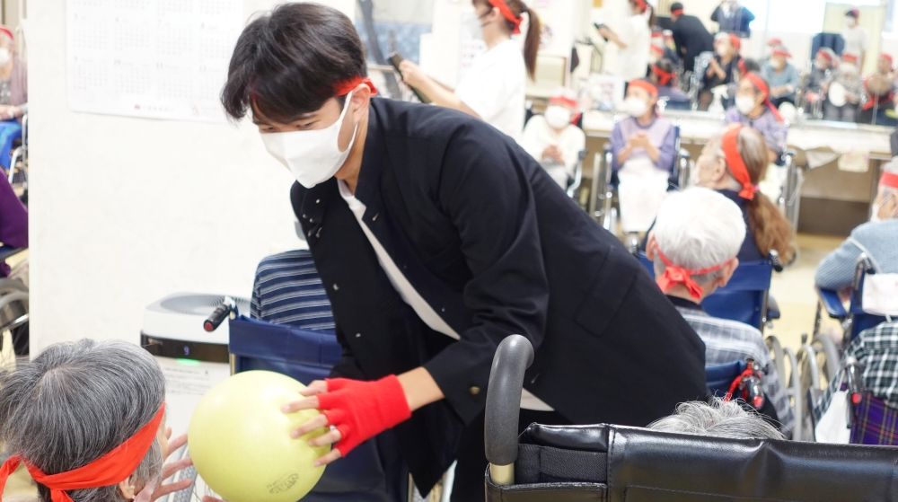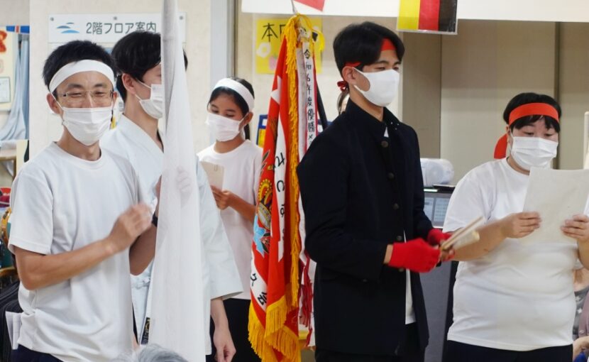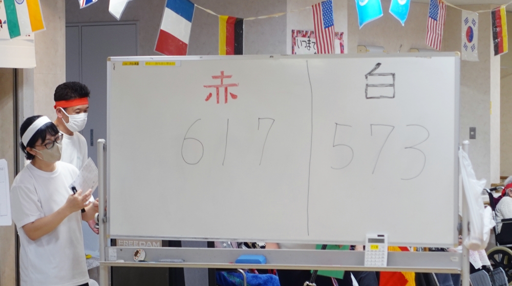 優勝の原動力となったのは今年新卒で入職した紅組の応援団長。大きな声と明るい笑顔で利用者様を力強く応援し、チームを一つにまとめていました。