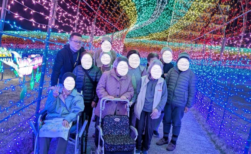やや肌寒さはありましたが、光のトンネルや動物をかたどったイルミネーションを楽しみ、記念撮影を行うなど、ご入居者様と職員がともに心温まるひとときを過ごすことができました。